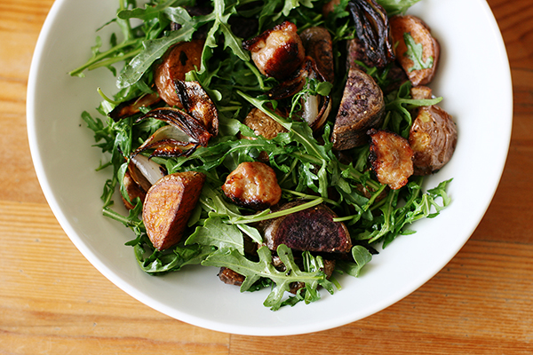Low-sodium sausage and potato roast salad with arugula and shallots
